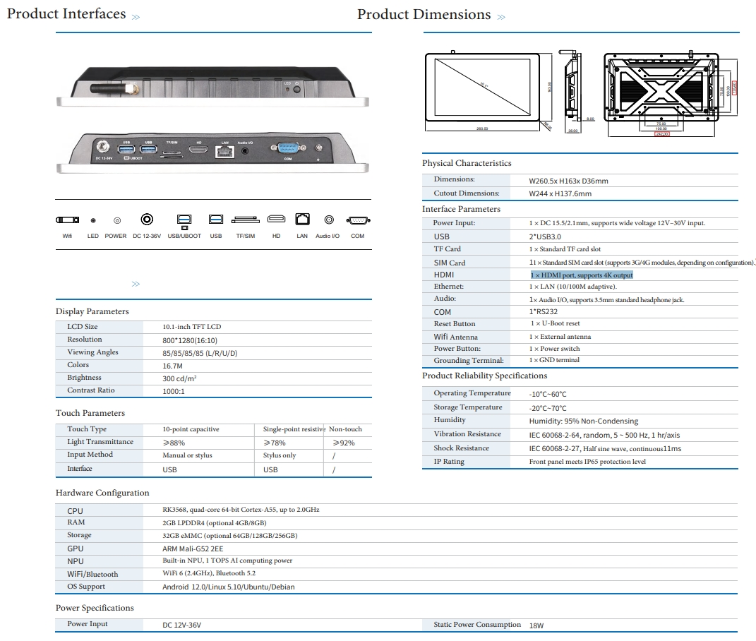 | CPU | RK3568, quad-core 64-bit Cortex-A55, up to 2.0GHz |